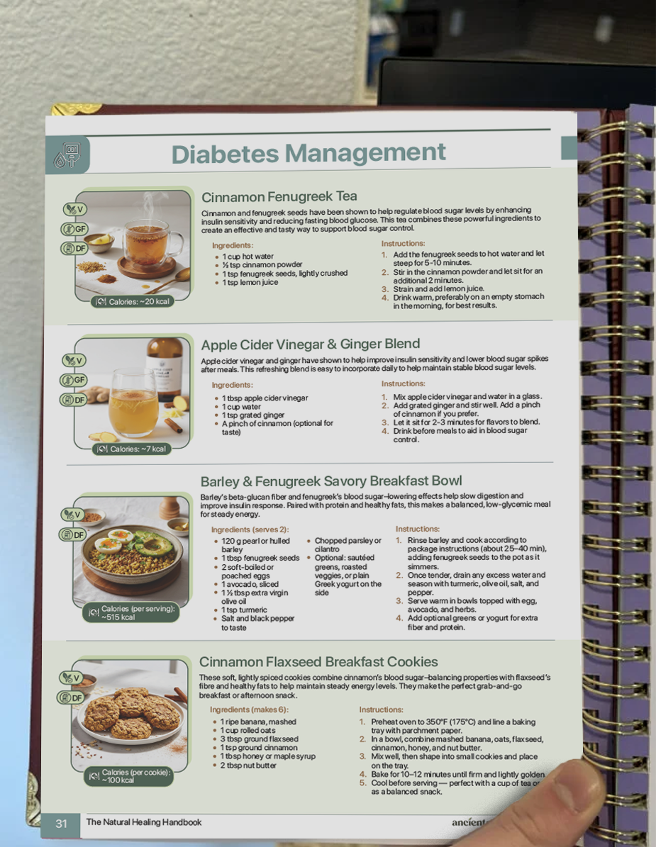 What I enjoy the most is how easy it is to use common ingredients for healing. The spiral binding is so handy in the kitchen. I'm not fond of pharmaceuticals anymore and just want to continue using holistic solutions. This handbook is the absolute best.